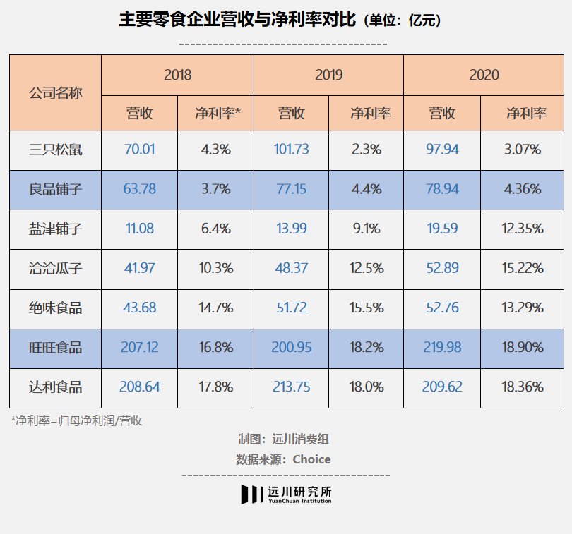 三只松鼠的销售净利率从2017年的5.44%在2019年降至2.35%,但同期营收增速逐年加快,从26%到45%。到了2020年,尽管销售净利率有所改善升至3.08%,但当年的营收却同比首度下滑。