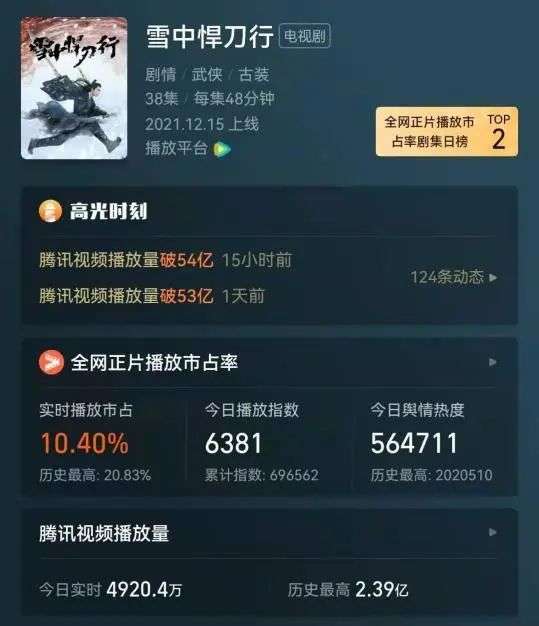 截至目前,该剧豆瓣评分5.7分,口碑两极分化。灯塔专业版数据显示,腾讯视频播放量破54亿,实时历史最高播放市占率达20.83%。