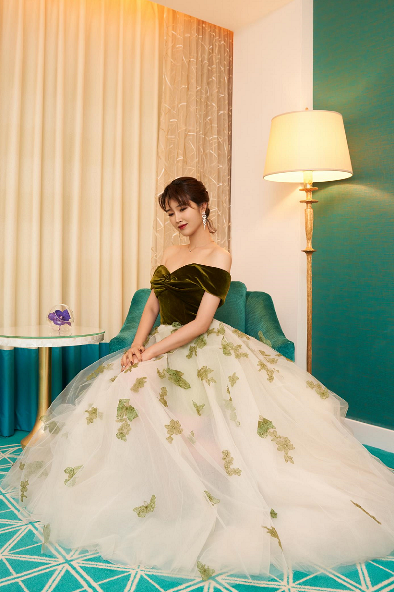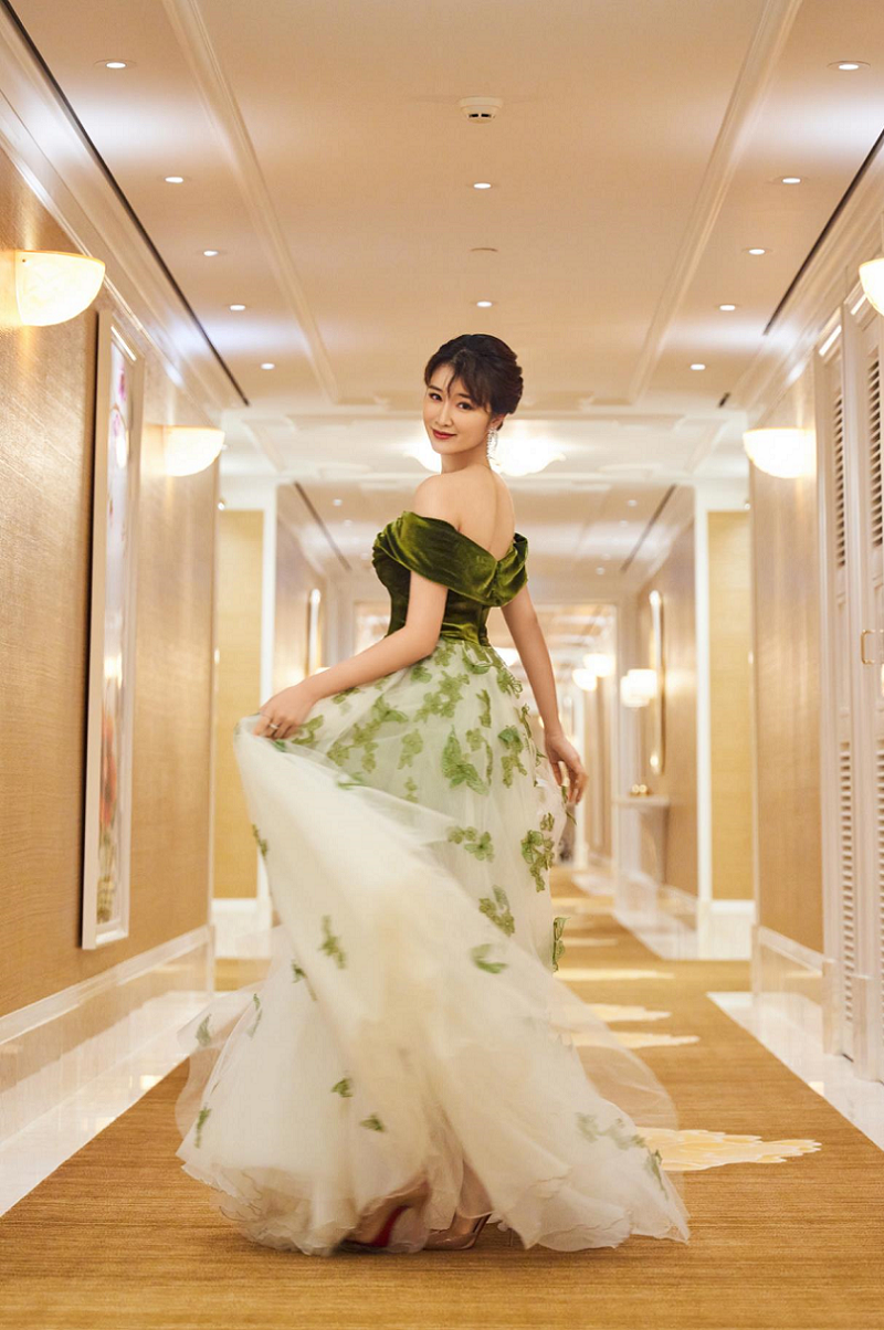 在第32届华鼎奖现场,奚望身穿LaMoon宝绿色重工定制礼服裙,绒面与纱制裙摆结合,裙摆镶嵌了立体清新绿色蝴蝶,与绒面包裹的上身完美结合,散发着灵动和温暖的气质。奚望高挑的身材和甜美的颜值,一出场就让在场观众和媒体朋友眼前一亮。