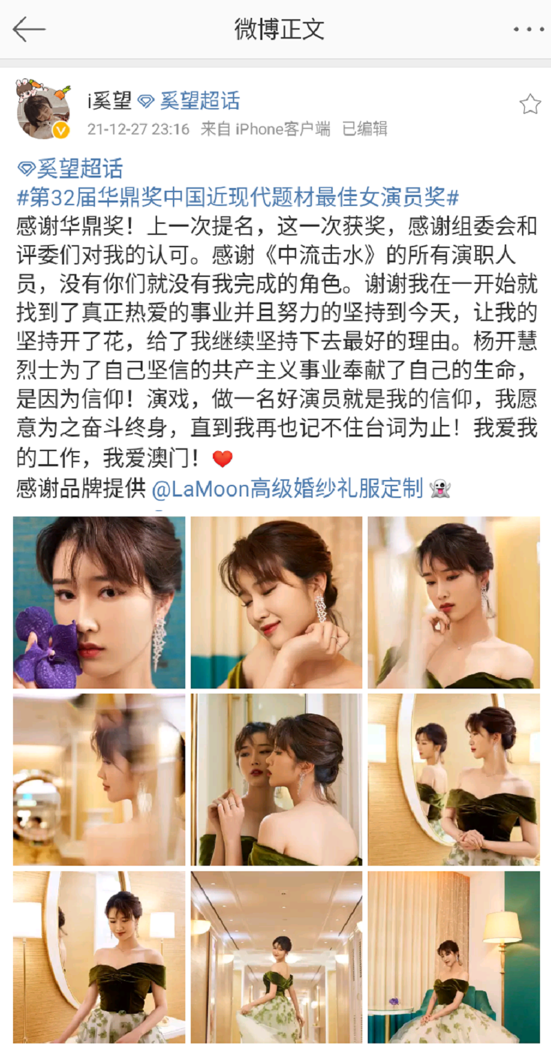 第32届华鼎奖近日在澳门举行,90后小花奚望凭借电视剧《中流击水》杨开慧一角,斩获中国近现代题材最佳女演员奖。