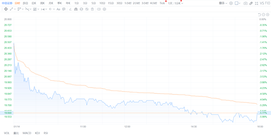 今日早盘,中信证券不出意外的跳空低开3%,而且一路走到黑,把整个证券板块一众“小弟”拖下水,要是说上证指数今日跑输创业板指数,肯定有中信证券的“功劳”。截至收盘,中信证券下跌5%,几乎收在最低位,证券板块下跌2.38%。