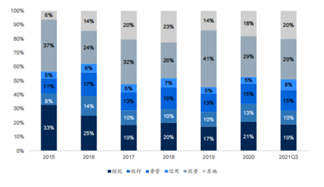 从公司过往的业务收入结构来看,公司业务越来越均衡。公司传统经纪业务占比逐年降低,而中介业务比列成为公司重要的业务增长点,