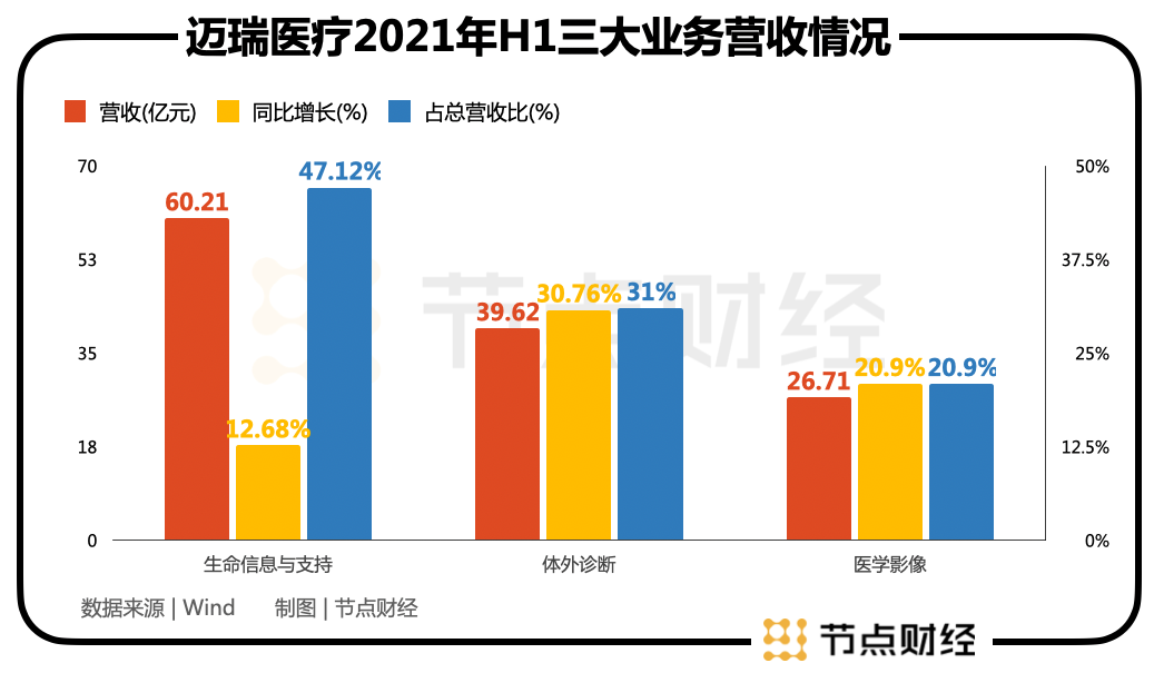 2021年半年报显示,生命信息与支持营收达到60.21亿元,同比增长12.68%,在营收中占比为47.12%;体外诊断业务实现营收39.62亿元,同比增长30.76%,占比31%;医学影像实现营收26.71亿元,同比增长26.87%,占比20.9%。