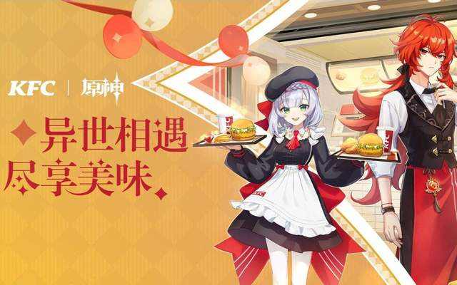 2021年3月,肯德基与知名手游原神合作,推出联动套餐。消费者只要购买指定产品,并对店员说出“异世相遇,尽享美味”的口令,就可获得游戏内道具以及限定的纪念徽章。