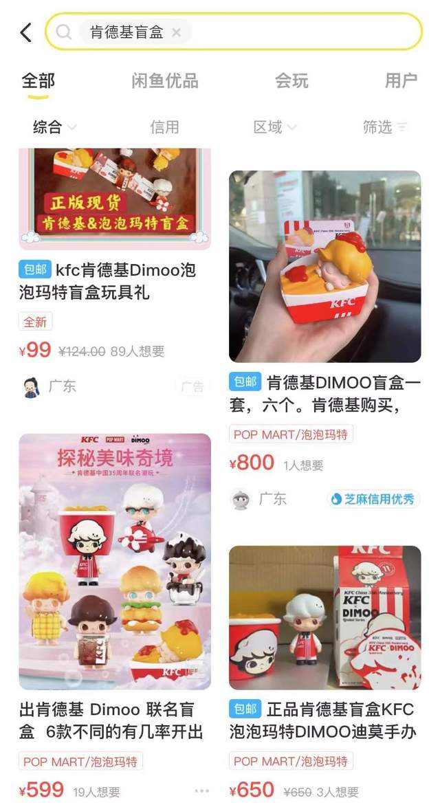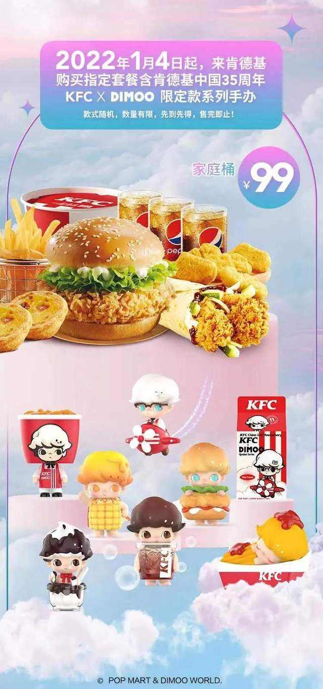 1月4日,肯德基推出定价99元的DIMOO盲盒套餐。依据肯德基的销售规则,每买一份99元的DIMOO套餐,就可得到一个盲盒。DIMOO是泡泡玛特的头部IP之一,深受粉丝喜爱。