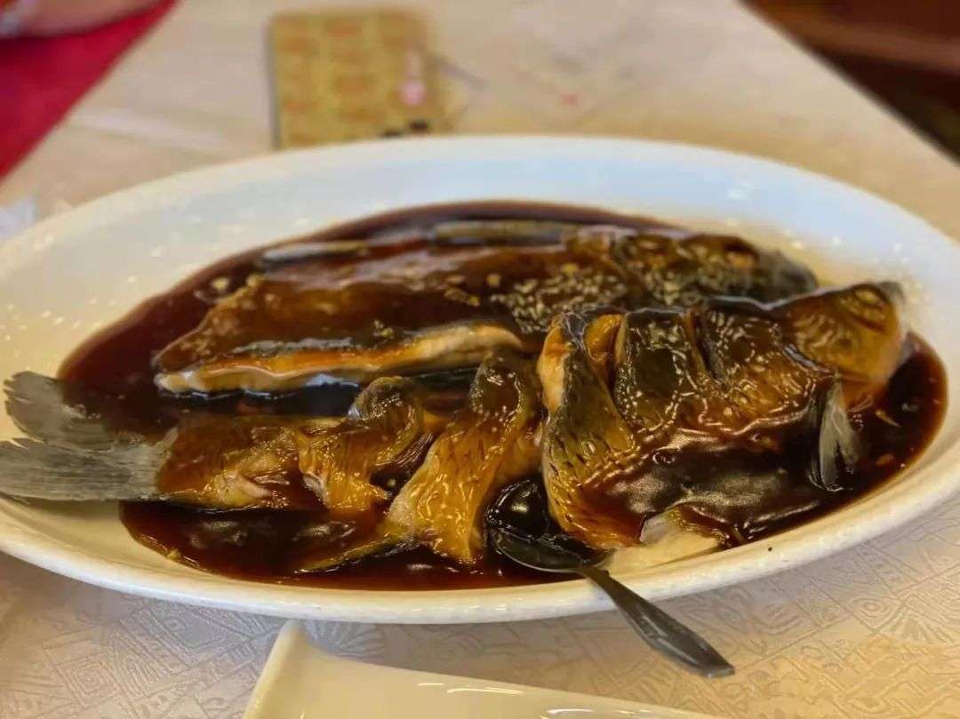 可要真的点了一份醋鱼,感觉就像吃了“冰糖草鱼”。淋着饱和度极高的甜酸汤汁的草鱼,入口满是甜腻腻的滋味。完全不似宣传中提的“酸不倒牙、甜不腻口、咸不齁人、鲜不发腥”。