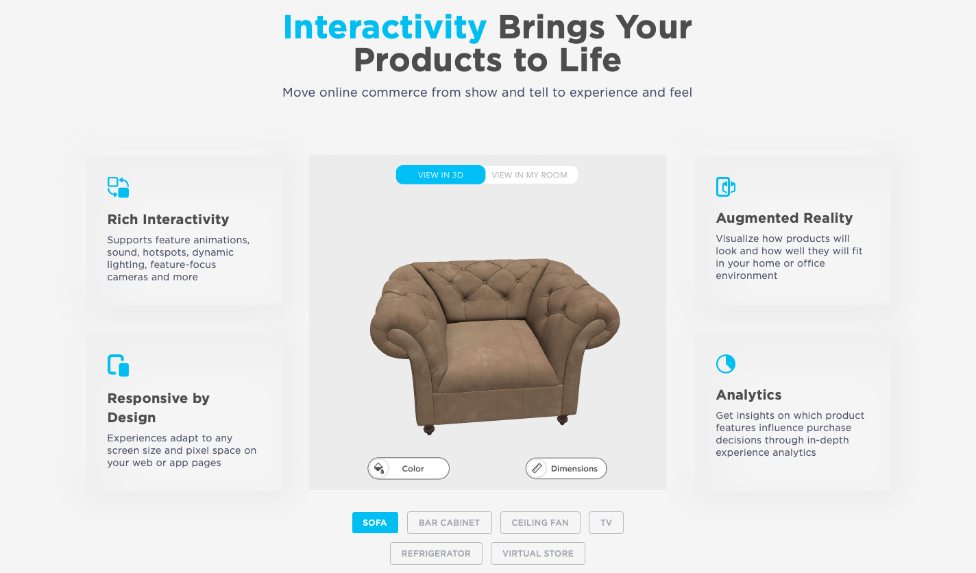 Aluru在采访中进行了一次演示:他从某电商平台上选取了一款沙发,拖过摄像头捕捉室内空间图像,然后将家具的3D投影拖放到屏幕内,并修改预览了不同颜色和产品细节。Aluru表示,这类展示也可以是交互式的,例如用户可以开关冰箱门,从而确定预留空间是否充足。