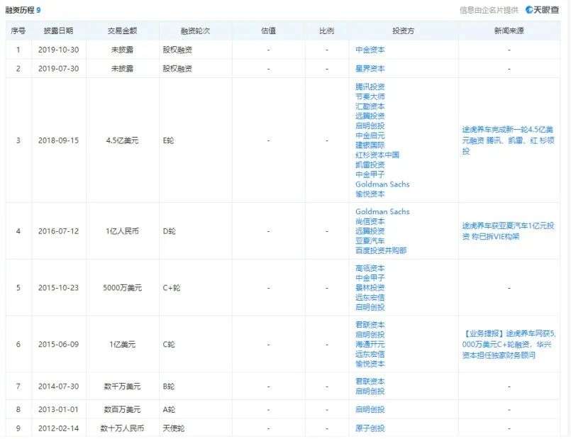 据天眼查官网信息,途虎养车成立于2011年,主营业务为轮胎、机油、汽车保养、汽车美容等业务,是主打汽车后服务的B2C电商平台。截至2019年10月30日,途虎养车已完成9轮融资,交易金额约为4.5亿美元的E轮融资由腾讯、凯雷资本、红杉资本等知名投资方和企业领投,老股东远翼资本、启明创投、高盛等共同参与跟投。