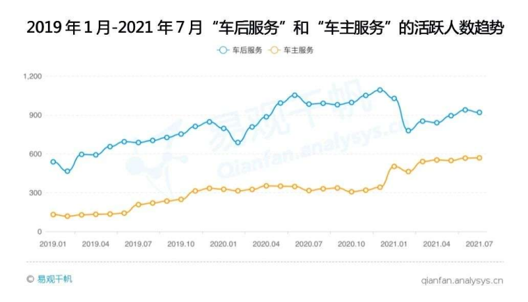 数据显示,以“途虎养车”为代表的“车后服务”在2021年7总体月活跃人数为919.13万人,“日产智联”等汽车厂商所在的“车主服务”同月活跃人数在568.24万人,两者量级相差近一倍。
