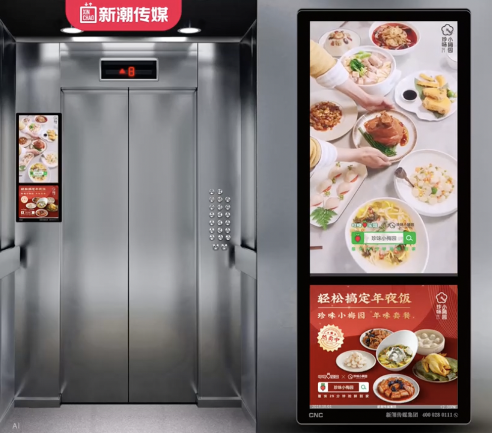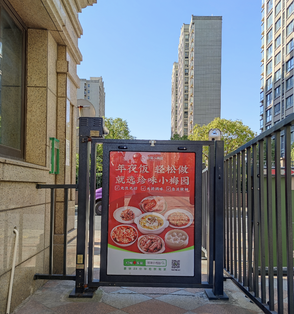 针对年夜饭场景,「珍味小梅园」输出了一支品牌TVC,想要传达的理念是“让预制菜走上更多家庭的餐桌”。品牌TVC的投放以上海地区为主要阵地,一方面通过新潮电梯广告辐射周边社区居民,另一方面还与深度合作的O2O渠道方叮咚买菜一起,在社区门禁系统进行平面广告投放。