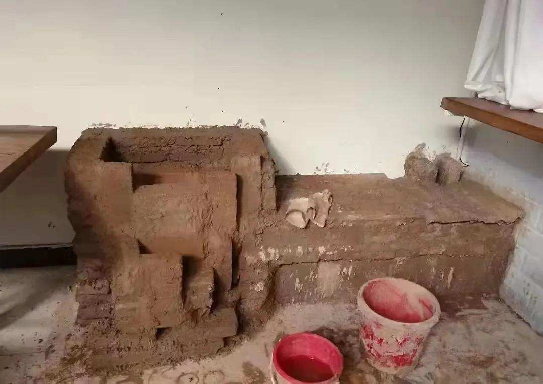 用旧砖、黏土、草杆制作火箭炉烧炕,再放上个不锈钢大盆就成了兼职烤箱;