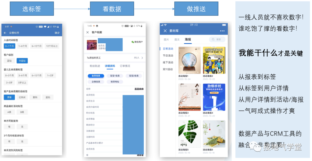 此时,想要和这些部门交好,可以从工具入手。不要整复杂的报表,而是根据看表人关心的内容,分层级提供数据。越是基层的,给看的数据越少,最好只留关键KPI。功能上,和CRM等工具打通,在提供数据的同时,直接提供可操作功能,这样才受一线欢迎(如下图)。