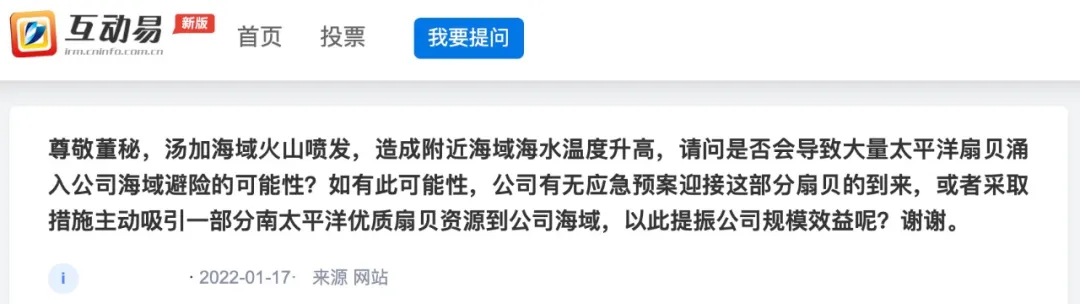 1月17日,便有投资者在深交所互动平台上向獐子岛董秘提问相关问题,甚至询问有无紧急预案迎接大批扇贝到来,或者采取主动措施吸引南太平洋优质扇贝资源到公司海域,从而提振公司规模效应。