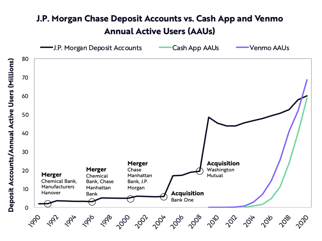 Square旗下的Cash App 和PayPal旗下的Venmo是美国两大支付软件,其存款账户和活跃用户正在超越美国最大的金融机构摩根大通银行(JPM),用时仅7至10年,而摩根大通耗时30年时间。截止2020年末的数据对比之,JPM的存款账户约为6000万美元,Cash App为5900万美元,Venmo约为6900万美元。
