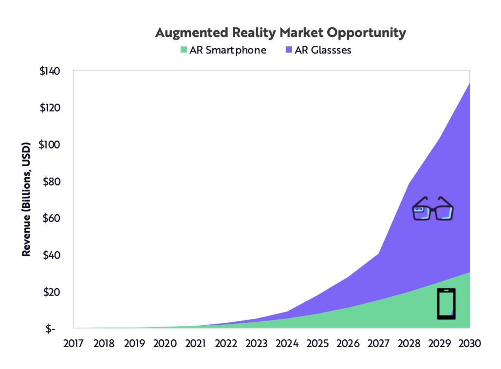 关于AR近年来,Snapchat,Facebook和Apple等公司增加了对增强现实的投资,促进了移动设备端使用。在2022年, AR头戴式产品会加速该行业的发展。到2030年,AR市场规模将从目前的不到10亿美元扩大到1300亿美元。