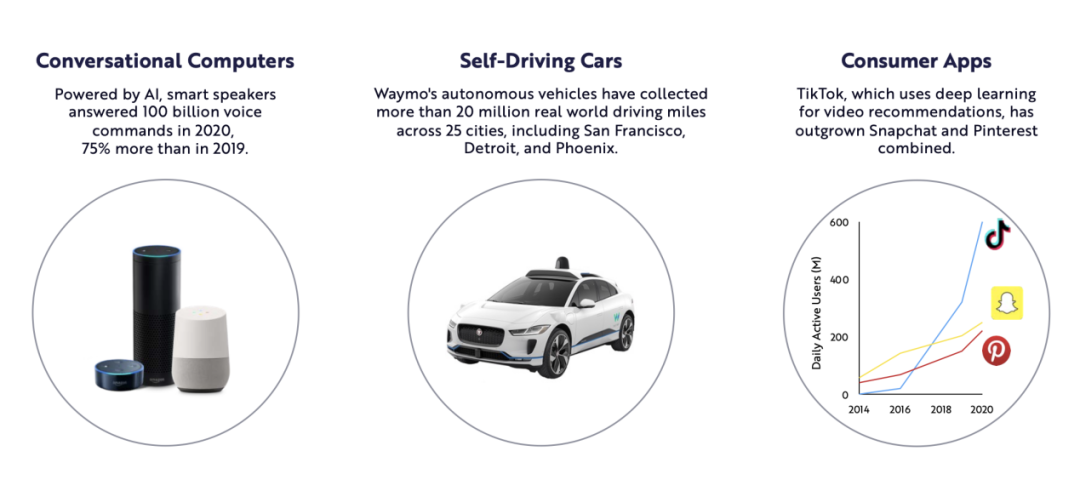 在AI的支持下, 语音交互产品如智能扬声器,在2020年能响应1000亿个语音命令,比2019年增长75%。 无人驾驶汽车如Waymo,在包括美国旧金山、底特律和凤凰城在内的25个城市收集了超2000万英里的实际行驶里程。 消费类App如TikTok/抖音,通过深度学习的技术为用户进行视频推荐,其发展速度已经超过了Snapchat和Pinterest的总和。