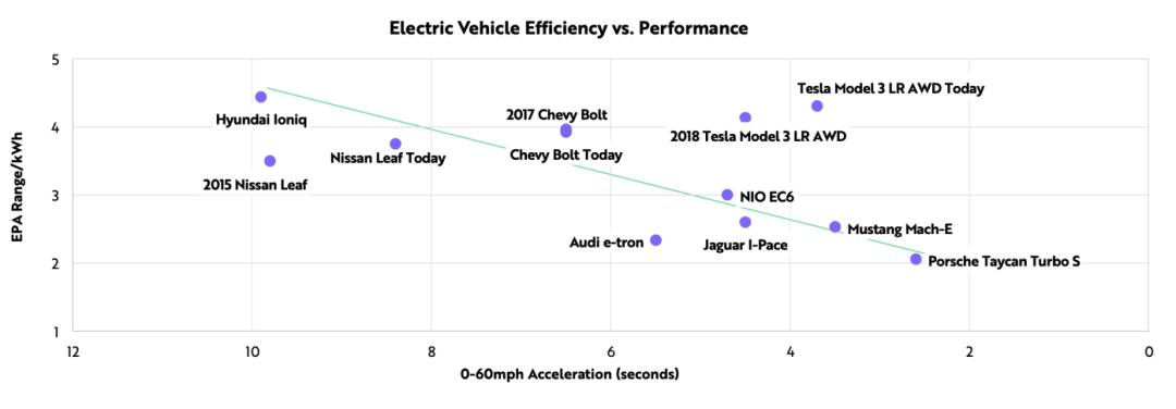 ARK的研究图表中,横轴为每秒加速度,纵轴为续航里程,