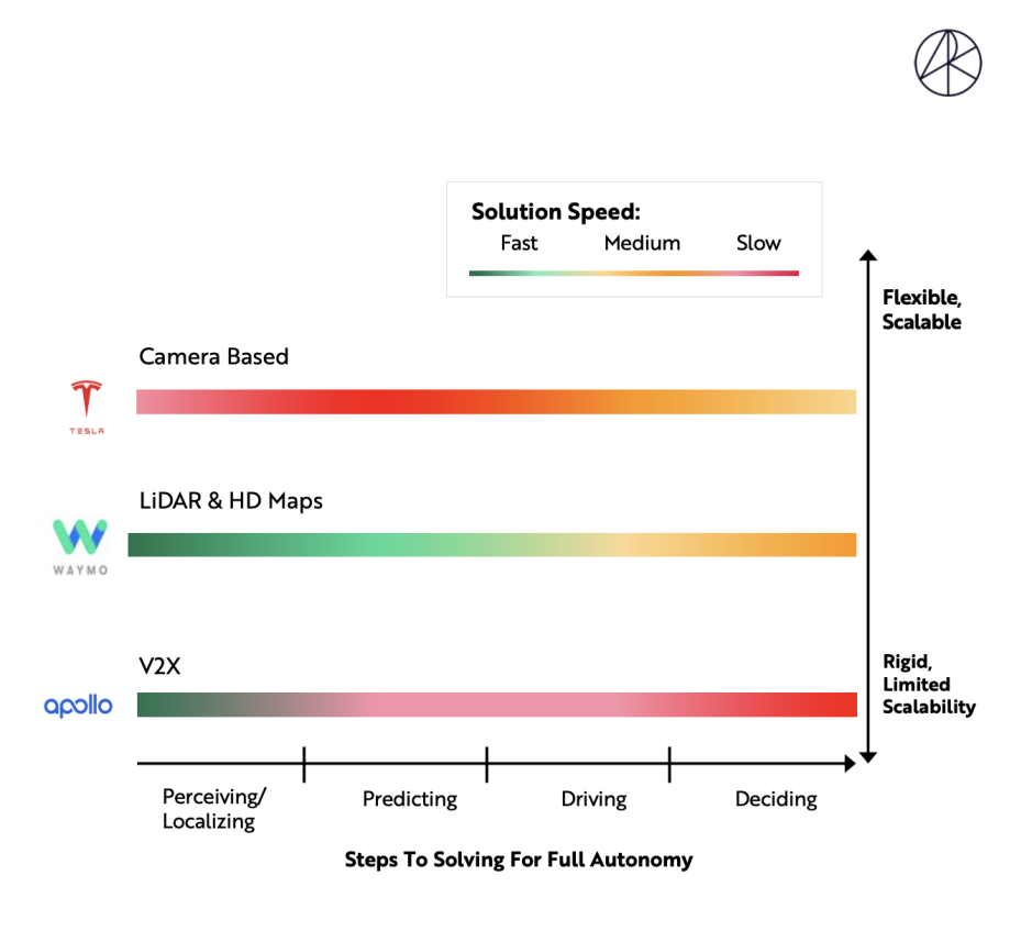 ARK也举例了三种来自中美明星科技公司采用的自动化出行策略演化: