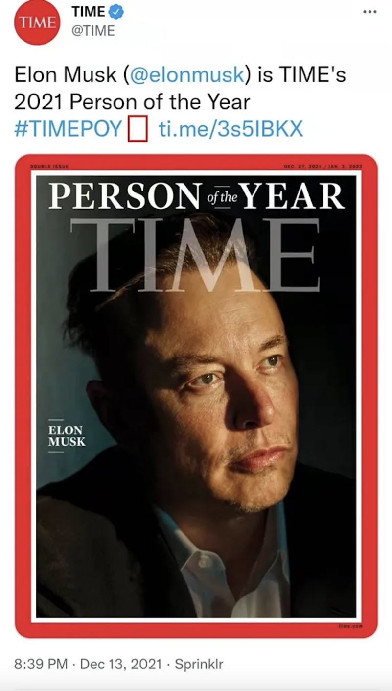 “作为世界上最富有的人,马斯克没有房子,最近一直在抛售财产。他将卫星送入轨道,并利用太阳能运行。他驾驶着一辆他自己制造的汽车,不需要汽油、也几乎不需要司机。他的手指一挥,就会引起股价的暴涨或暴跌。他的每一句话都被一大群粉丝奉为圭臬。当他横扫全球时也梦想着移民火星,他的方下颌透露着不屈不挠。”以上是来自美国《时代周刊》对马斯克的获选评论。