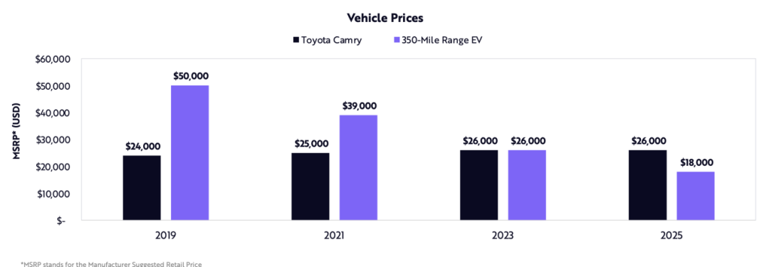 数据显示,电动车与燃油车的销量相比,2020年疫情期间,燃油车销量减少15%,而电动车增加33%。莱特定律得出,电池产量每次翻倍,其成本会下降28%。由于电池成本是电动车最高的部分,因而成本下降才足以在价格上与燃油车一较高下。 在2019年拥有一辆相似档次的电动车(350-Mile Range EV)总成本已低于丰田凯美瑞(Toyota Camry),包括所节省的汽油费、维护费用、保险等。实际售价如下表显示,至2023年将持平,而2025年电动车标价明显大幅下降: