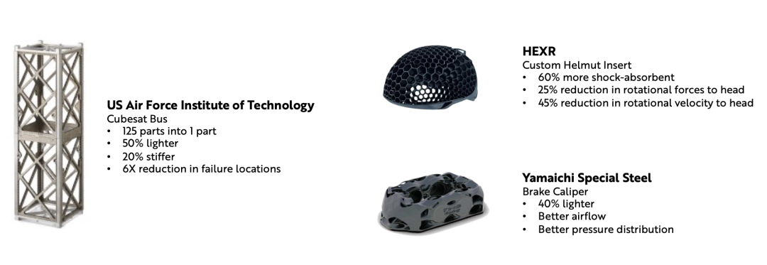 3D打印技术节省了时间成本,也更环保,它创造了全新的部件架构,并在全球多个领域得到了广泛运用。比如疫情期间用以抗疫,从呼吸机中的阀到口罩; 最大的机会是在航空航天、自动驾驶设备机器中的应用;解锁AI制造领域,如美国空军技术学院制造的立方体卫星巴士、HEXR的定制头盔等。