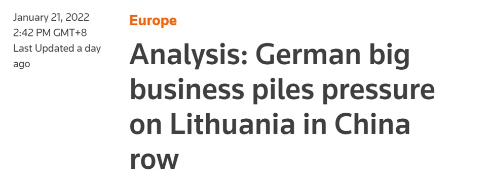 除立陶宛企业外,立陶宛还面临德国企业施加的压力。路透社报道称,有知情人士透露,德国—波罗的海商会在近日致立陶宛外交部长及经济部长的信函中表示,立陶宛产品对中国的销售都已经停摆,部分企业可能不得不离开。该商会呼吁两位部长寻求“建设性解决方案”,恢复与中国的关系,“这些企业的基本商业模式正面临困难,一些业者可能别无选择,只能关闭立陶宛生产线。”