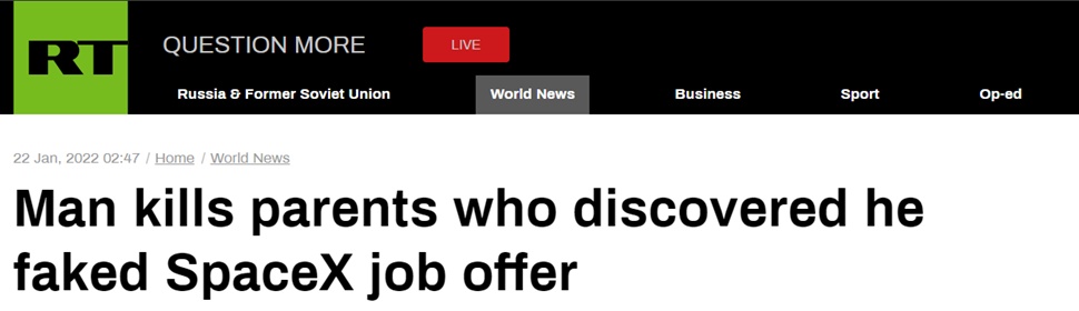 RT报道称,钱德勒在生活中多次向父母撒谎,包括谎称自己在上大学、还在保险公司上班、以及考虑入职SpaceX公司赚钱的机会等,此外,他还试图通过创建虚假电子邮件来使自己的谎言看起来更真实,包括与他口中就读的大学和就职的保险公司通信等等。但是钱德勒的父亲开始产生怀疑,因为钱德勒经常缺钱。