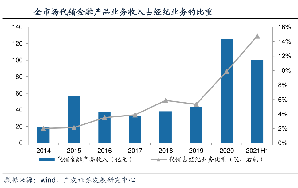 据广发证券非银团队统计,2020年券商实现代销金融产品业务收入125亿元,同比增长89.07%,2021年上半年达100.5亿元,占经纪业务比重由2014年的2%提升到2021年上半年的14%。