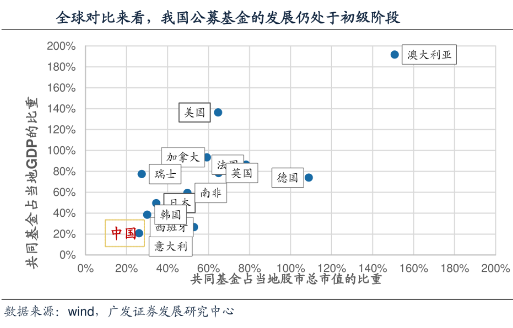 广发证券认为,横向对比来看,无论是从各国公募基金占股票市值的比重,还是占GDP的比重,目前我国公募基金行业均处于发展初期,规模成长空间广阔。