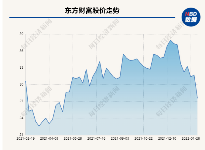 2月14日(本周一),东方财富盘中快速下跌,全天跌幅超过13%,股价击穿30元关口,当日收于27.49元/股。与此同时,当日证券板块也是全线下跌,广发证券、东方证券同日跌幅分别为9.65%、4.1%。