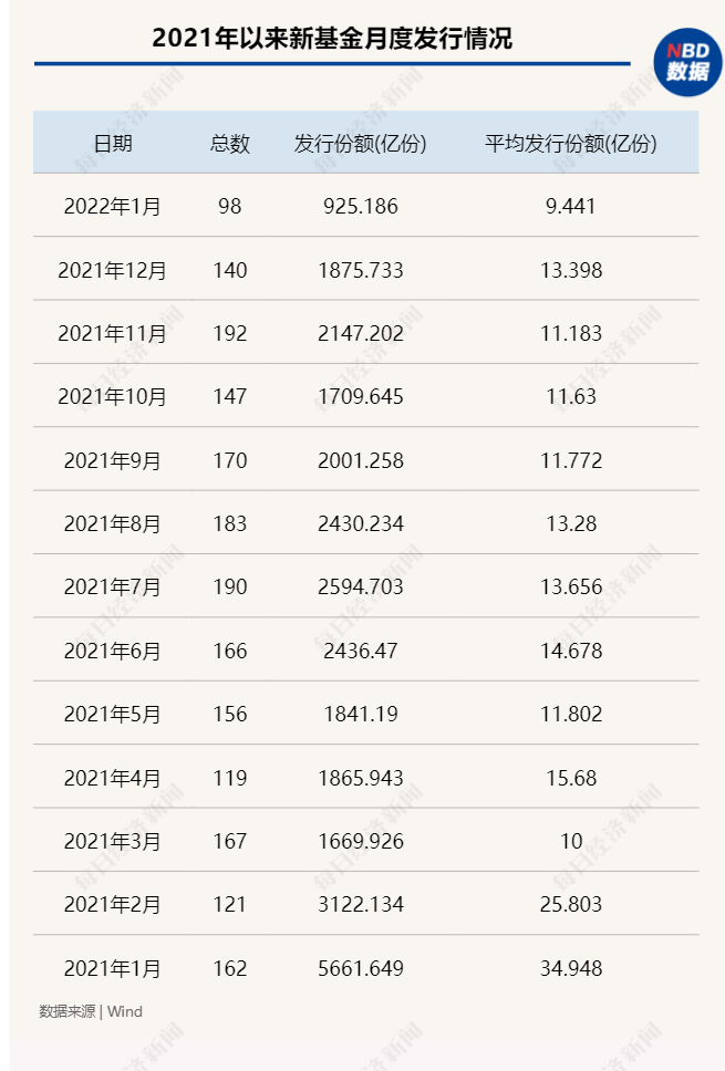 2022年1月,新基金成立的数量陡然下降,数量只有98只,较2021年12月的140只猛然下降了42只,平均发行份额从去年12月的13.4亿份下降至9.44亿份。
