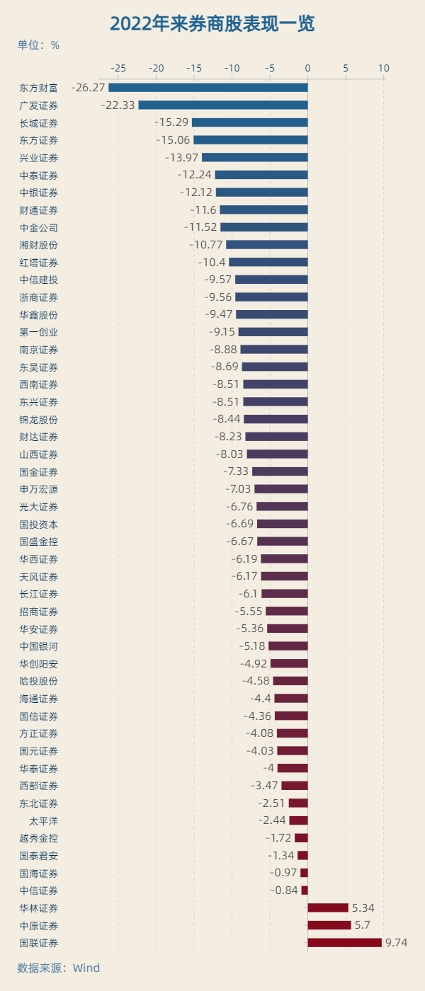 根据申万行业分类,统计数据显示,2021年50只券商股(含当年上市的财达证券),共有9只上涨,其余全部下跌。涨幅居前的为广发证券、东方财富、东方证券、兴业证券,分别为55.77%、43.88%、30.04%和15.6%。