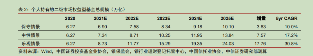 另据中信证券非银团队预计,根据中性偏乐观判断,未来5年存款搬家和整体减配房地产是存在较大可能性的事情,预计居民权益型基金配置增量在8万亿元到18万亿元之间。