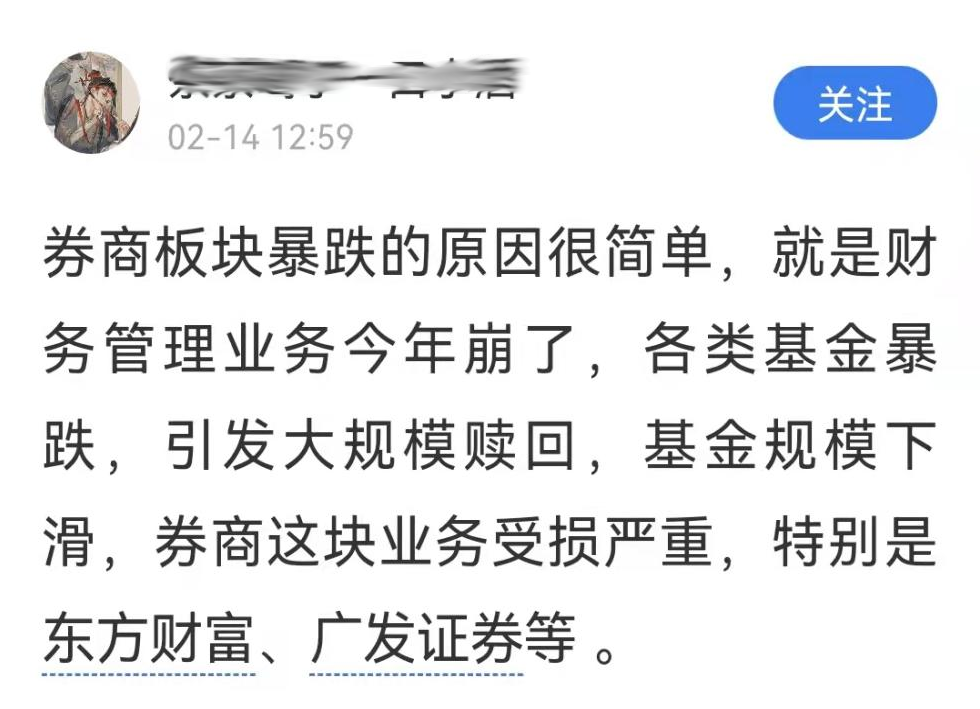 本周一(2月14日),东方财富、广发证券等主营业务与公募基金相关性较大的券商出现了明显的下跌。