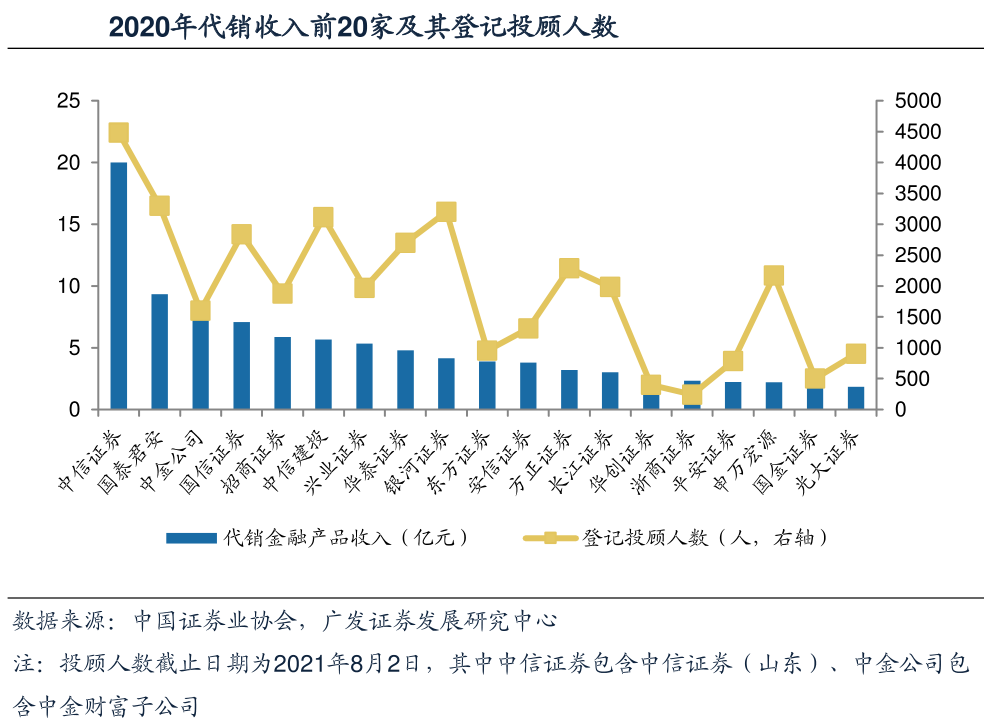 从代销金融产品的业务体量来看,目前在行业内中信证券处于一枝独秀的地位。2020年中信证券代销金融产品收入近20亿元。据公司去年中报统计,去年上半年中信证券实现代销金融产品收入14.28亿元,同比大幅增长104.2%。