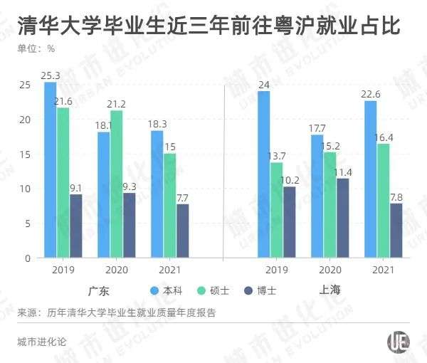 到了2021年,无论是本科、硕士还是博士,清华大学毕业生选择上海的占比,清一色压过广东。且上海三项数据分别领先广东4.3、1.4和0.1个百分点。显著的反超优势,使上海和广东二、三位的总排名正式对调。