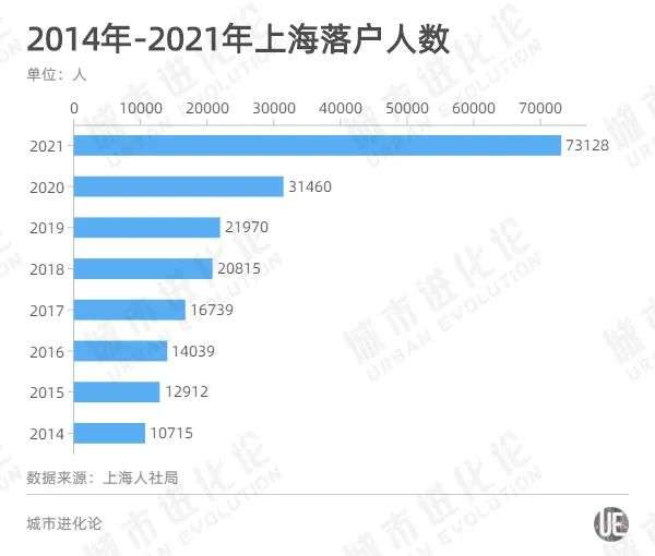 同年,上海落户人数直接在2020年31460人的基础上翻番,总数高达73128人。其中,通过人才引进落户的数量,更是较2020年激增171%,约为2017年至2020年几年人数的总和。