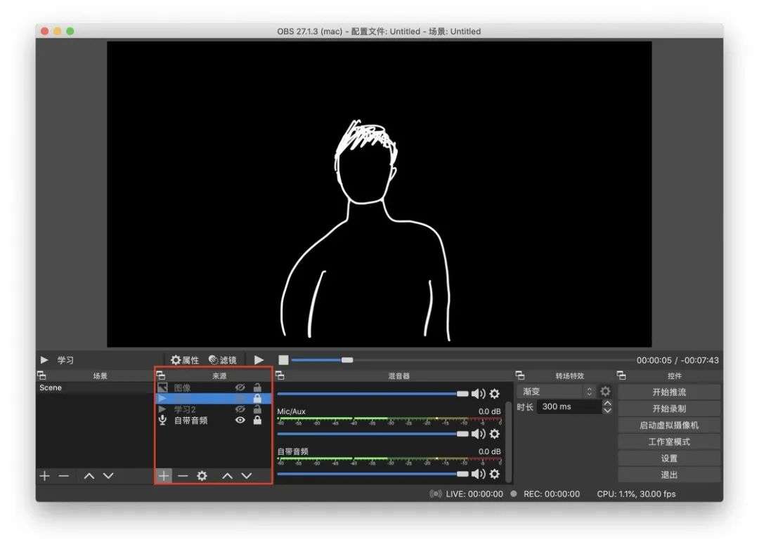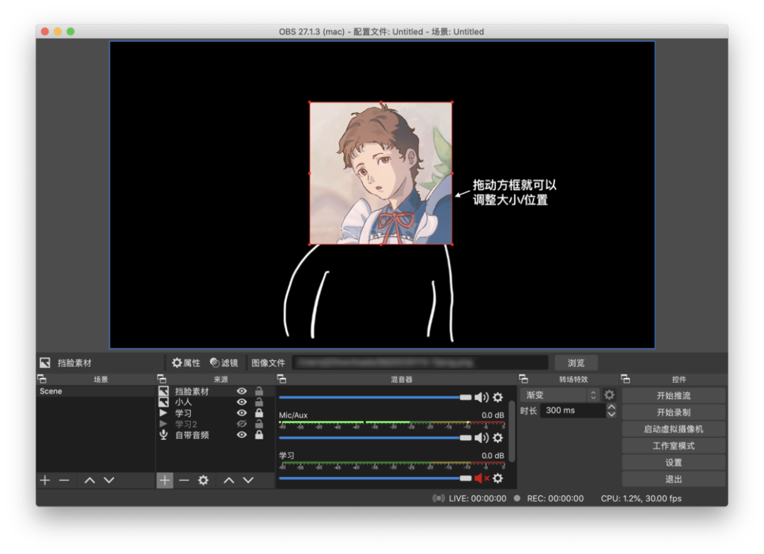如果想要用到「挡脸」的功能,像是在线上自习室需要实时出镜,但又不想完全露脸,就需要用到这个原理。最简单的就是插入一个「图像」作为来源,放在视频最上面,使用鼠标调整大小和放置位置,达到挡住脸的目的就可以。