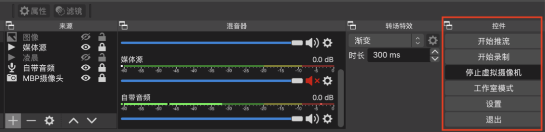 重启后打开 OBS,点按右下方「控件」一栏中的「启动虚拟摄像机」,即可在 Zoom 中继续设置。