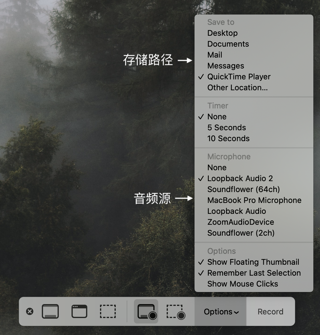 使用 QuickTime 录屏的问题就是它不会把系统发出的声音录进去,所以需要借助其他软件,如我使用的Loopback Audio ,或者免费的Soundflower 。