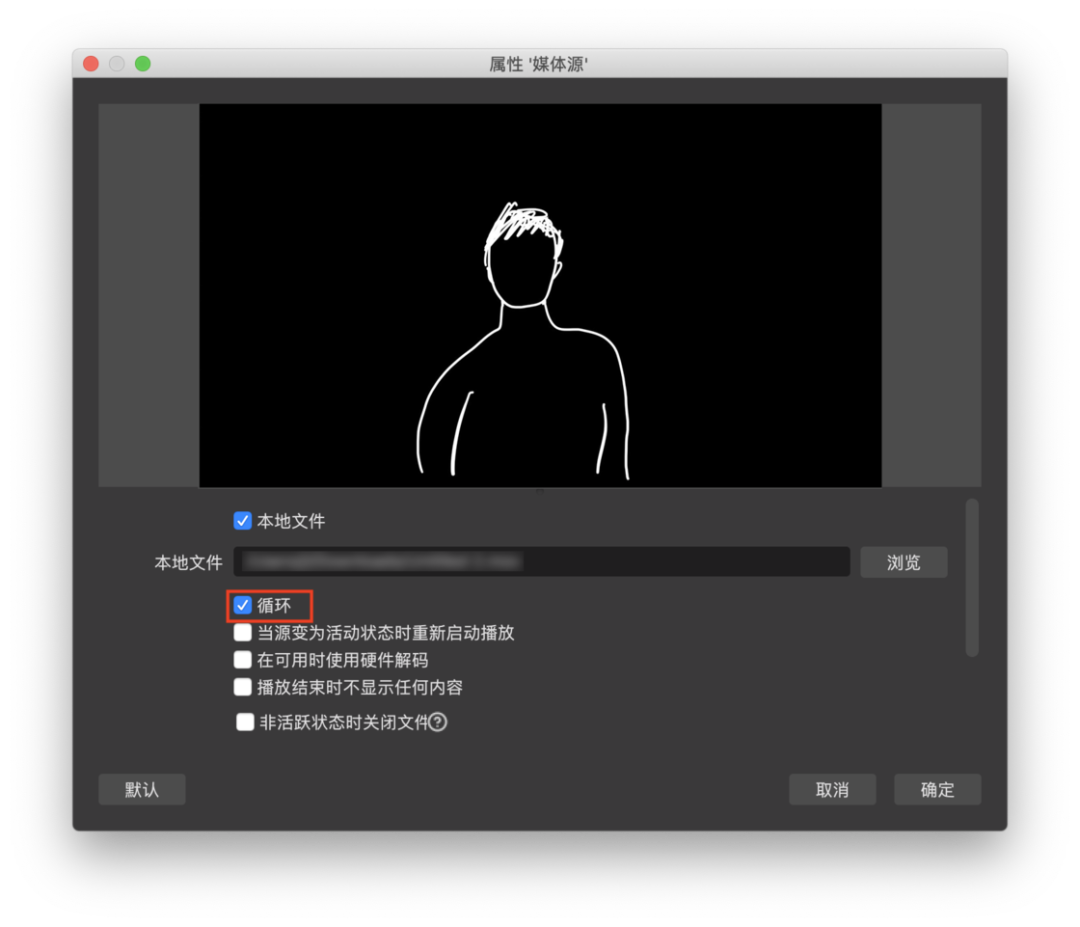 在「来源」中,点选「+」号 – 媒体源,选择视频的存储位置。要使其不断轮播,就要确认点选了「循环」,并要确保「播放结束时不显示任何文件」没有被选中。其他的选项不论选中与否都不会有太大的影响,所以保持默认就可以。