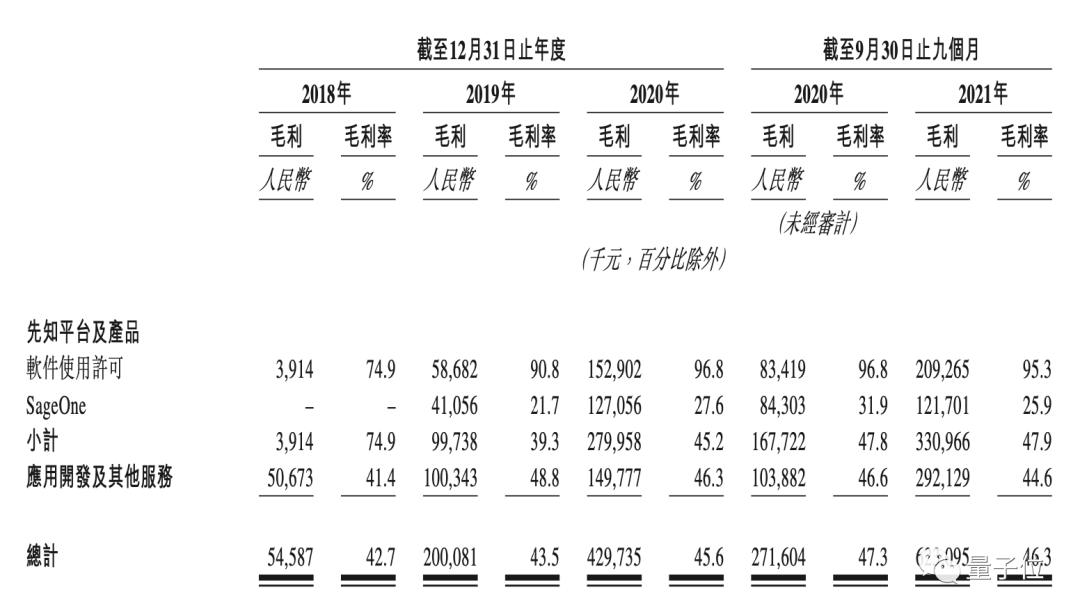 与此同时,第四范式的毛利也几乎随之同比例增长,以上四个周期(指2018~2020年及2021年前9月,下同)的毛利率分别为42.7%、43.5%、45.6%、46.3%。