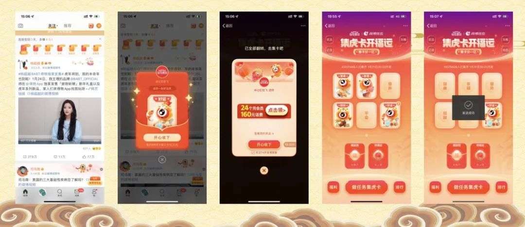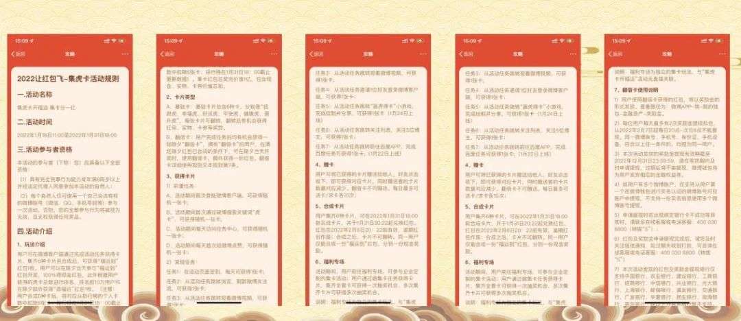 6.任务集卡:路比较贴合微博的路线,而且和“百度”进行联动,横向串联;7.集卡思路:虽然在卡片的速录是借鉴抖音支付宝,也能在翻卡后有奖池的概念,在策略研究和如何特和自己做了一定的改进和变化。(对比去年福牛,是有较多的提升)