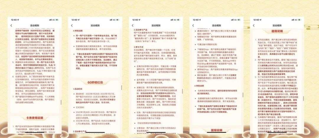 相同策略:在玩法方向一致的情况下,在用户视角是否目标清晰可见、在唤醒机制上是否做了阶段性唤醒、在主活动视觉C位气泡策略等,做好差异做好体验是核心关键;业务属性:业务在做春节活动,都是在核心争取春节的气氛,让用户对自己有记忆点,而不是到了春节DAU直线下滑,争夺的是用户的时间和留存属性,那么更要和业务做结合,而不是为了活动做活动;也不能因为为了业务做业务,ROI高但是参与人数少,也是成败的衡量方式;谈一个插曲:微视为什么今年没有做春节活动?是因为去年参与人数少,还是ROI不好,还是DAU逐年下滑,这些都是不可知的事情,但是可知的是微视没有找到自己的核心定位以及如何与竞品做“内容差异化、商业模式差异化、策略玩法差异化等等”这个都是微视要思考的,也期待23年微视可以寄继续做活动,重整旗鼓。