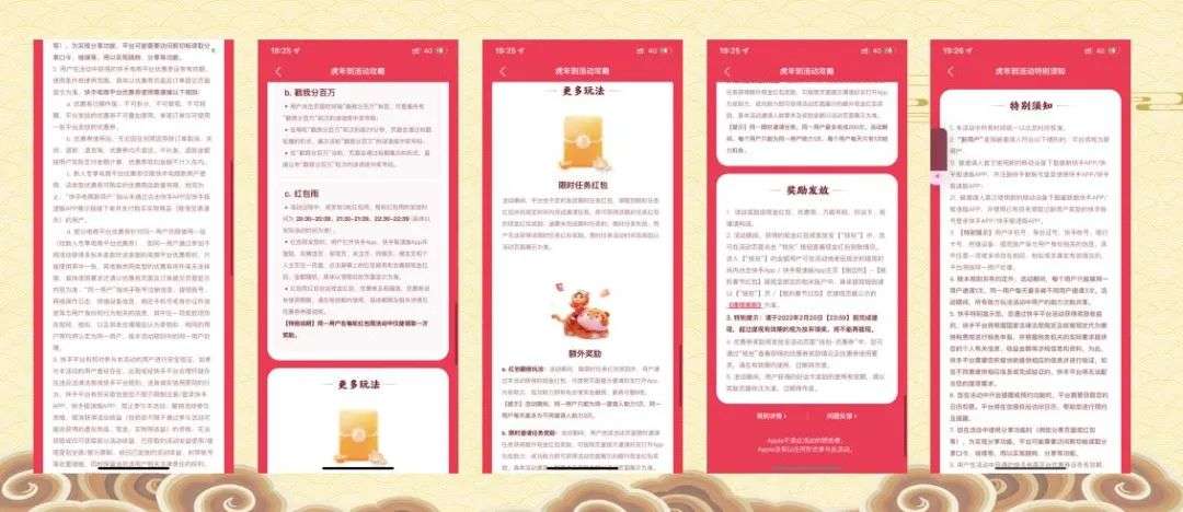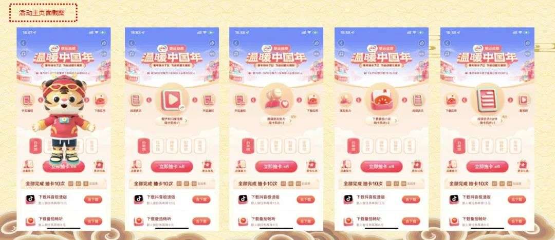 游戏主线A:卡片类玩法中从节日气氛,到概率可控性,以及2段式阶梯升级,很好的控制控制参与人数与成功合成的概率配比,以及可以根据活动的进程加大获得卡片的非重复性配比。还可以和更多的业务结合,从获取“券、关注、广告曝光”的商业化串联,都可以有很好的协同机制;游戏主线B:闯关和摇号为主线的,其实也是和卡片是一样的,机会+1的逻辑,这种活动不是太复杂,就是距离目标较远,不如卡片类和目标感更近一些,目标性不够强,用户干部制度不够高;游戏支线:虎年的春节活动支线活动如“跳一跳、森林巡护、打年兽、守护、虎虎闯关、红包雨、写福字等”都是很好地与春节的年味的元素做结合;目标感上:像“抖音”会把任务和倒计时预约,放在活动的主C位置,主C不一定总是卡片,而是根据时间节点的不同,让用户的目标感增强,而且每个任务和任务之间的连贯性很好,用户的体感比较顺畅;在闭环上:游戏的简易程度、流畅度、任务串联、用户流转闭环、权益和回报率权衡、传播方式、APP与微信端的那个载体闭环,都是需要在设计之初做用户地图的路径规划;在细节上:传播是否有裂变属性、文字是否够吸引人、UED的体验、Push的策略、单埋点还是双埋点;场景设计:你的用户载体都有哪些、传播场景和交互场景的关联度;权益设计:你的用户喜欢那些权益且是喜欢玩法、还是喜欢奖品的大小、权益是否和主业务有关联度;提现方案:大多数靠内容起家的平台对支付逻辑,提现逻辑还是较弱一些,此处是一个未来提升的关键点。奖励权益就是补贴方式是也是看得见的奖励、所有的权益看似是付出,其实只是达到(拉新、留存、复购、DAU的提升)等指标目的ROI值而已。商业目的:很多的平台都是为了活动而活动,在春节活动玩法越来越成熟化的同时,除了原有的dau指标,更要把“广告商业化、电商商业化、等”商业化属性加入。