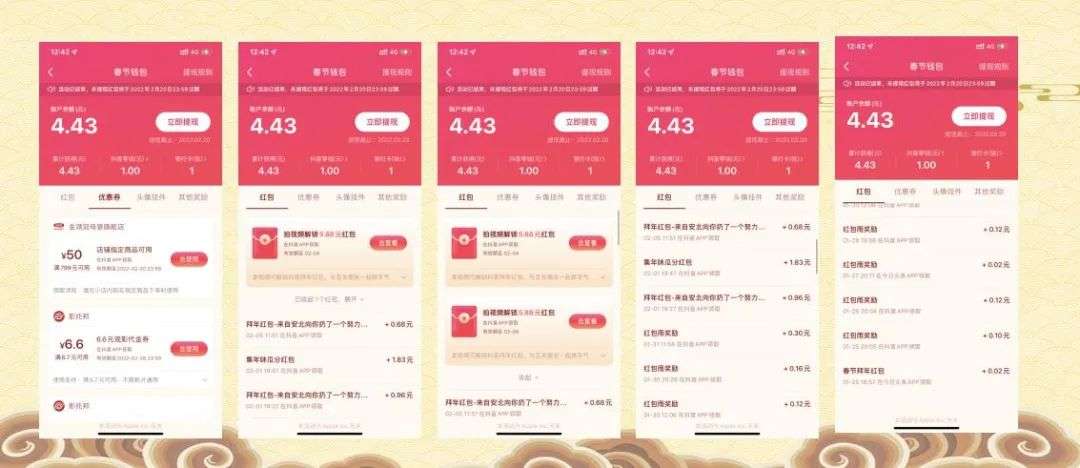6)提现方式:存钱罐任务和年味卡任务所以积累的钱分开(算是两个红包模块),且设置提现门槛儿,有效地降低了成本,提高了收益。(让贡献度低的用户,无法提现,提高了门槛降低了成本)