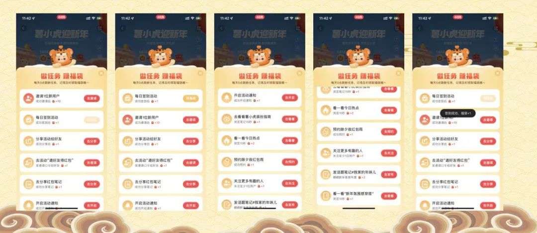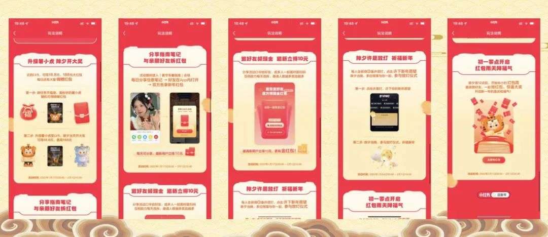 邀请好友得红包:活动时间01月17日00:00-02月01日10:00放飞许愿灯:活动时间01月24日00:00-02月01日10:00提现时间:2月20日-3月31日前升级薯小虎:除夕开奖可得18.8元,最高188元;每日拆福袋:随机可得吉林红包、小虎装扮;分享笔记拆红包:你需要的治安那都在这里;放飞许愿灯:小红书万人放灯,一起拆福新年;邀好友的红包:邀新立得10元,更好金红包可拆;拆解任务机制:+个数(小红书)任务1:每日签到活动,成功签到后福袋+1个;任务2:邀请1位新用户,成功邀请后福袋+10个;任务3:分享活动给好友,成功分享后福袋+1个;任务4:去活动好“要还有的红包”,发邀请口令给好友福袋+1个;任务5:去分享红包笔记,成功分享笔记福袋+1个;任务6:开启活动通知,成功分开启通知福袋+1个;任务7:去看看薯小虎装扮指南,浏览笔记15秒福袋+1个;任务8:看一看今日热点,浏览15秒福袋+2个;任务9:预约除夕夜红包雨,成功预约福袋+1个;任务10:关注更多有趣的人,至少关注1位用户福袋+1个;任务11:发话题笔记#我家的年味儿#,晒晒现年家具布局福袋+2个;任务12:看一看“新年气氛感穿搭”,浏览15秒福袋+2个。