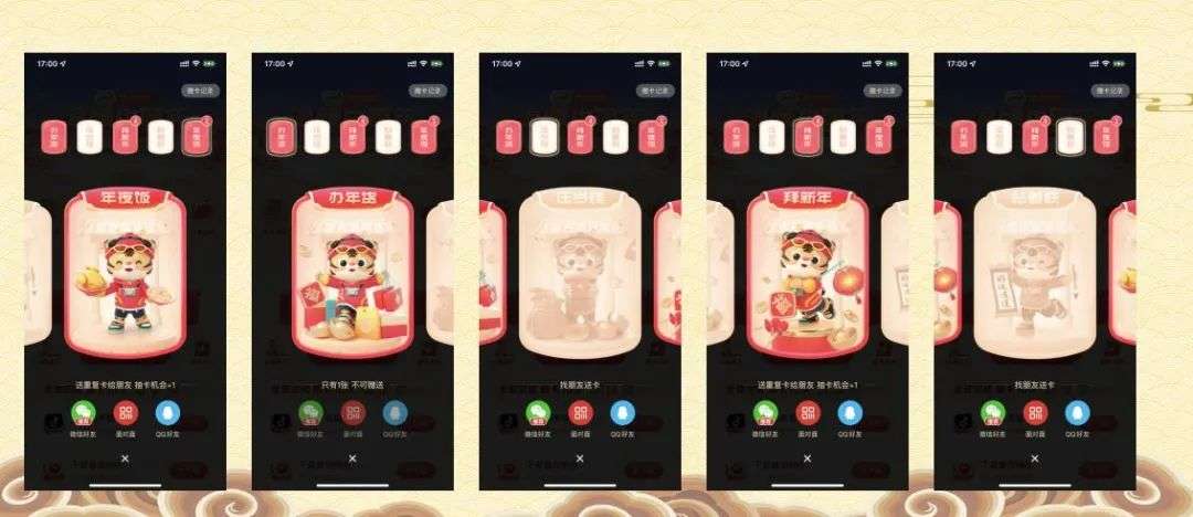 抽卡方式(第一阶段抽必得“拜新年”卡、控制点在“压岁钱”,第二阶段抽卡随机得到5个年味卡控制点在“好运”)