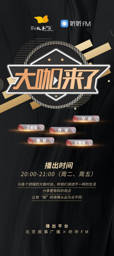 每周二、周五晚8点《大咖来了》在FM95.4北京故事广播和听听FM同步音视频直播,请锁定FM95.4北京故事广播和听听FM,与大咖们尽情畅聊吧。