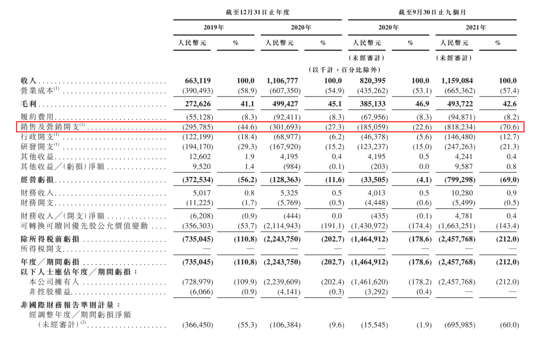 2021 年 Keep 虽然实现了超过 40% 的收入增长,但亏损却大幅增长。根据招股书,2019 年、2020 年和 2021 年前三季度,Keep 经调整的亏损净额分别是 3.66 亿、1.06 亿、6.96 亿,2021 年的亏损比例显著扩大。